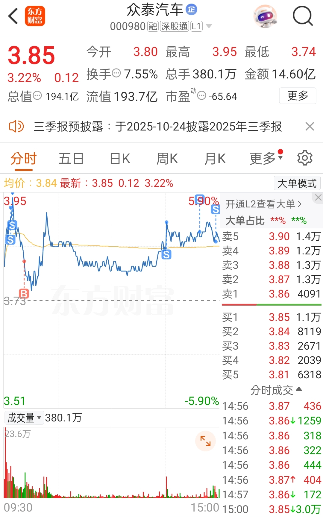 $众泰汽车(SZ000980)$ 费物不板尾盘又砸了几手