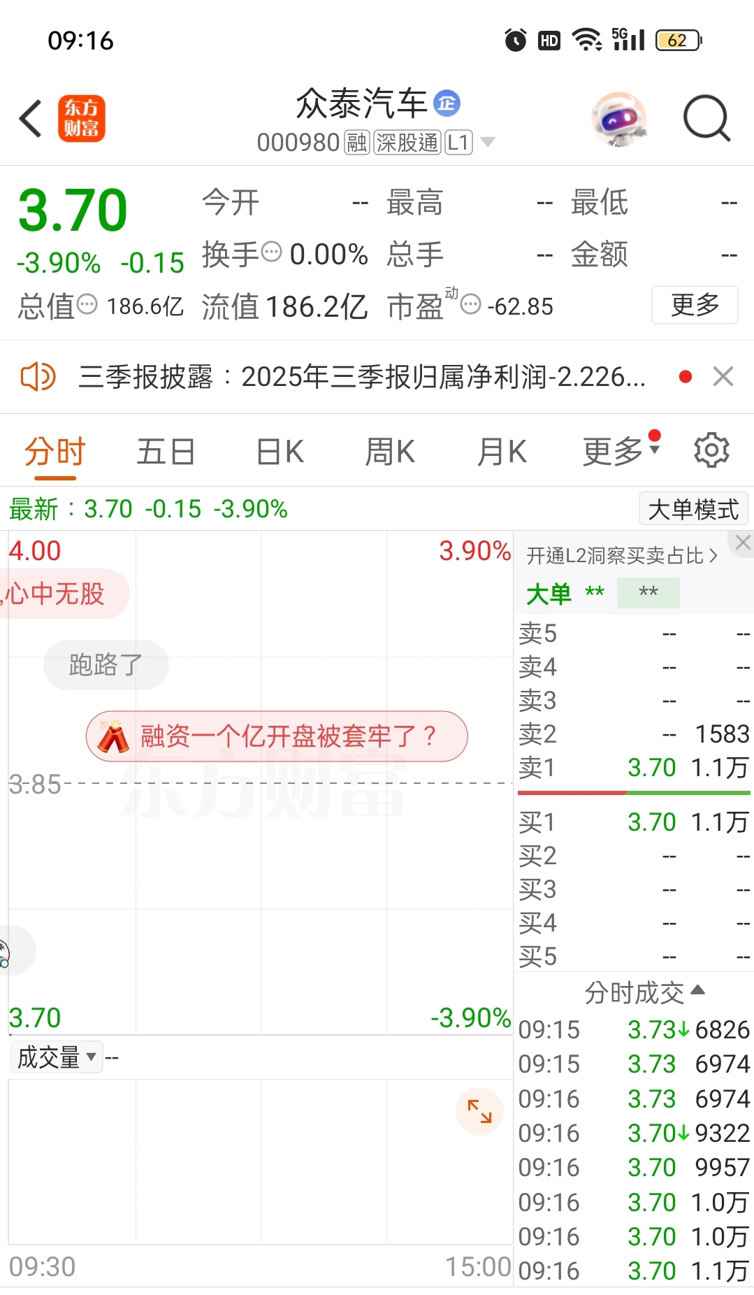 $众泰汽车(SZ000980)$ 昨天融资一个亿开盘被套牢了?
