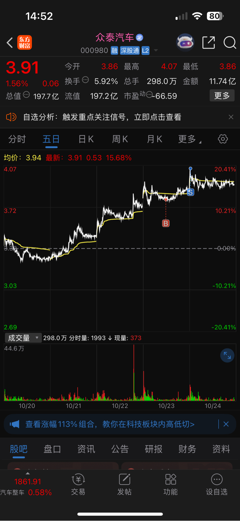 $众泰汽车(SZ000980)$ 出了点,过几天看情况再说。今天就不接回来了。没量!