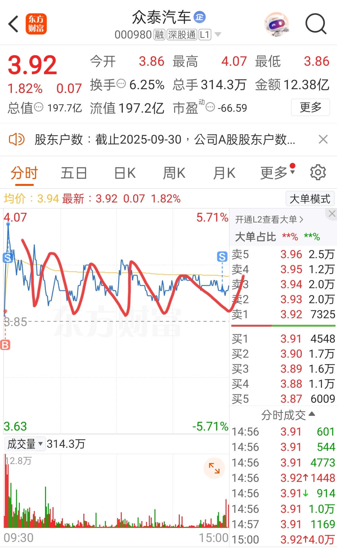 $众泰汽车(SZ000980)$ 以前视频上刷到砖家给我上课说分时图锯齿形横盘是一种典型主力在对倒出货,下周拭目以待,不是出货下周还涨的话底仓还可以再多喝口汤