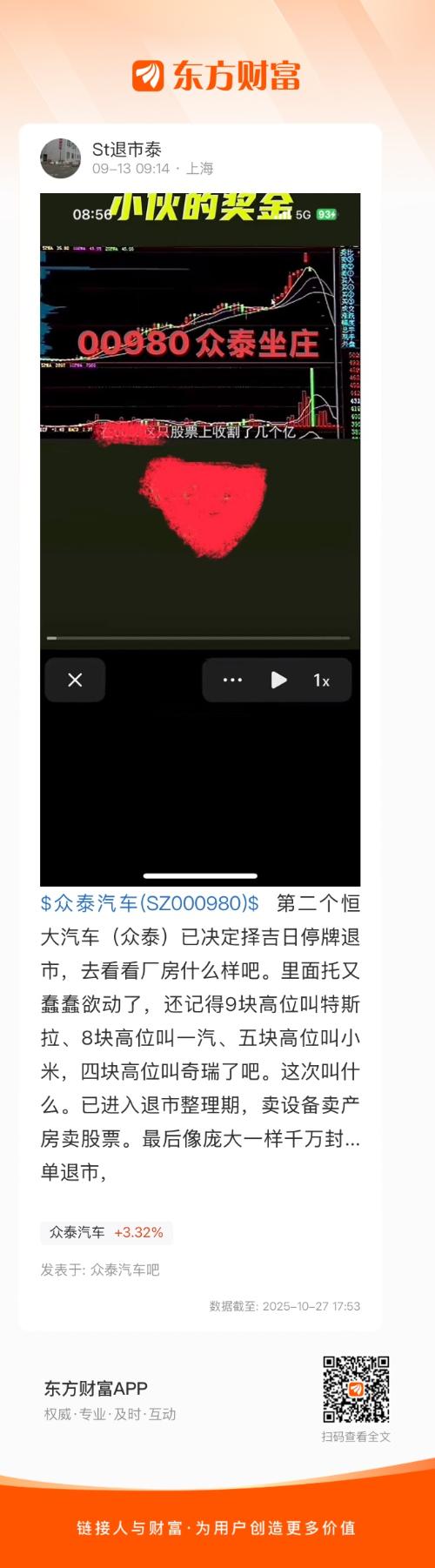 $众泰汽车(SZ000980)$ 第二个恒大汽车(众泰)已决定择吉日停牌退市,去看看厂房什么样吧。里面托又蠢蠢欲动了,还记得9块高位叫特斯拉、8块高位叫一汽、五块高位叫小米,四块高位叫奇瑞了吧。这次叫什么。已进入退市整理期,卖设备卖产房卖股票。最后像庞大一样千万封...单退市,