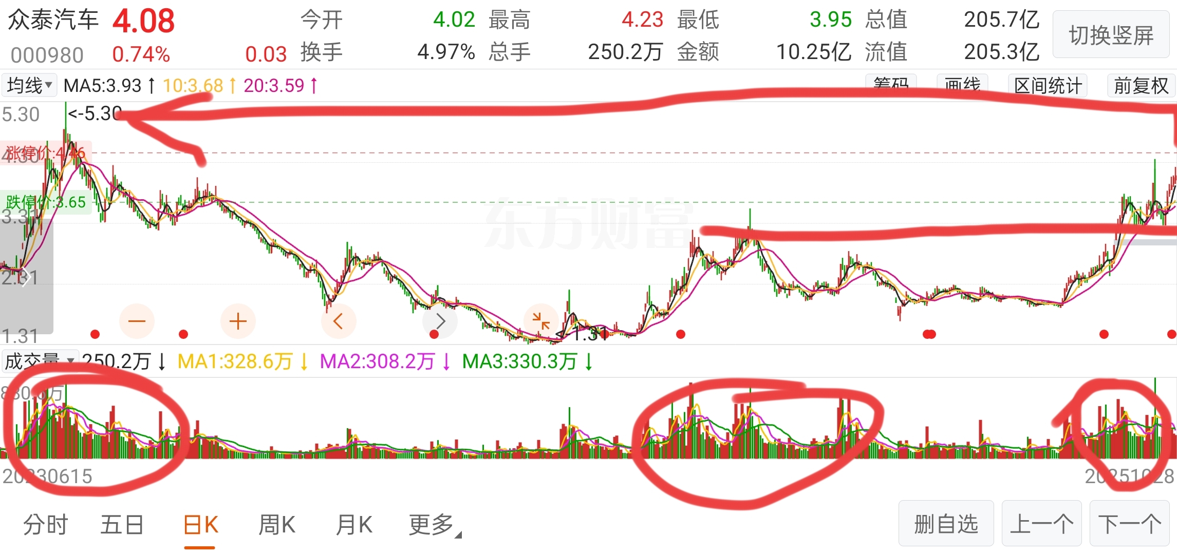 $众泰汽车(SZ000980)$ 两年半前的4.5~5.3的套牢盘的成交量,相比这几天的成交量,主力要是直接强攻上方5块感觉会被砸S,且看明天如何走势