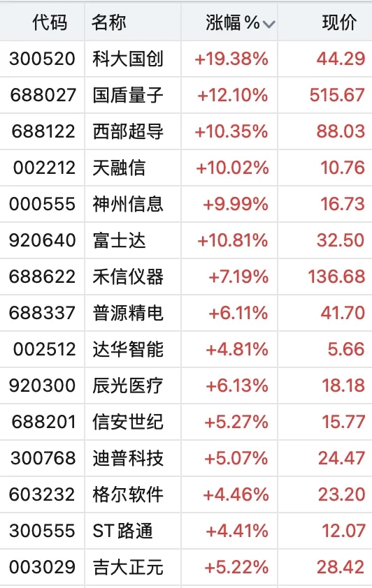 量子科技概念近期反复走强,10月29日盘初,概念股再度走高。神州信息涨停,科大国创涨超19%,国盾量子盘中创新高,西部超导、信安世纪、富士达跟涨。