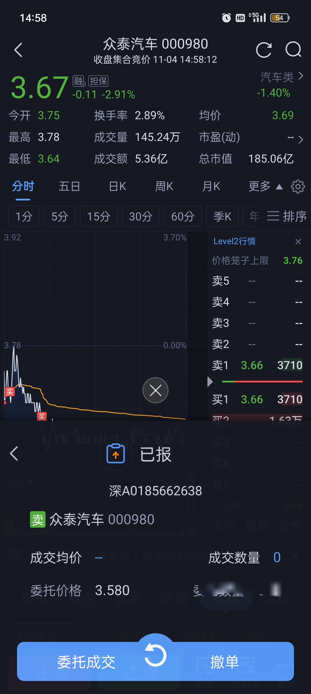 $众泰汽车(SZ000980)$ 反弹无力,做了个反T,及时撤,看明天了
