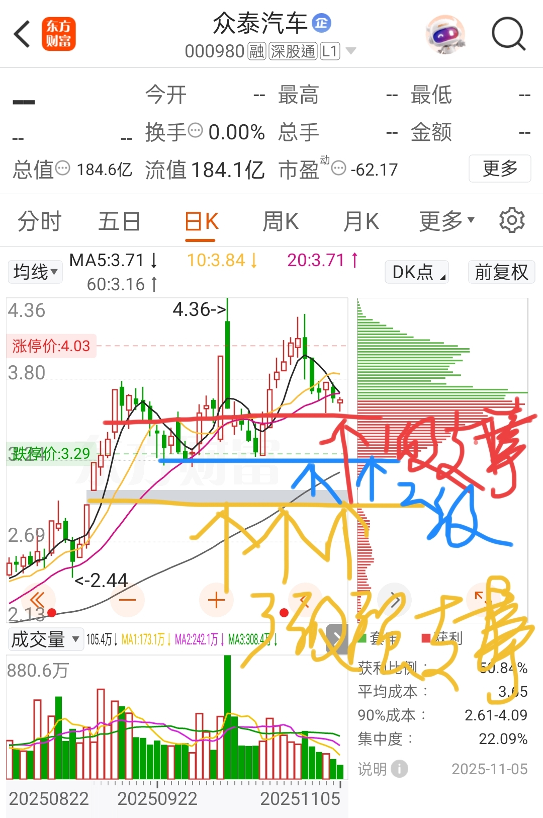 $众泰汽车(SZ000980)$ 缺口三级强支撑就要往下跌到2块5大甚至2块2,大家拿捏好这几个支撑位置