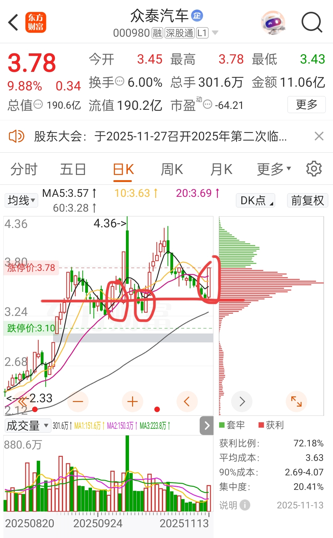 $众泰汽车(SZ000980)$ 为了吸筹,故意阴跌了12天,让大家都失去耐心,大家烦躁了一个涨停就把筹码怪怪吐出来了?这样特见效,但是这招很司空见惯的,看明天走势了,是继续拉板还是冲高回落再洗两天