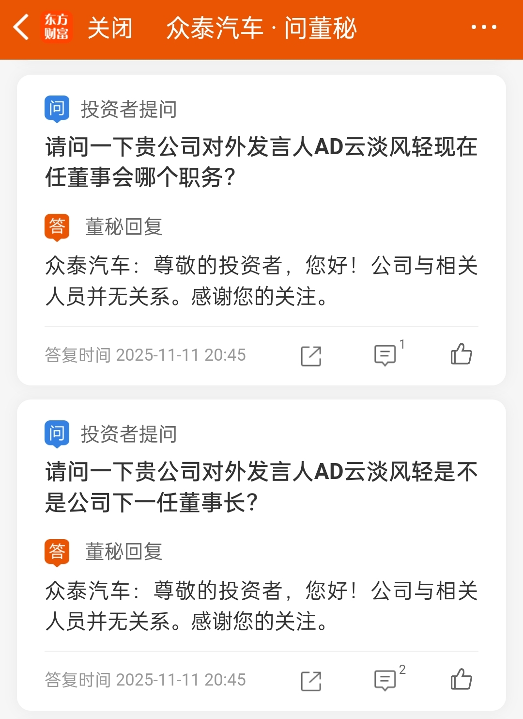 $众泰汽车(SZ000980)$ 这届董秘真会挑问题回复