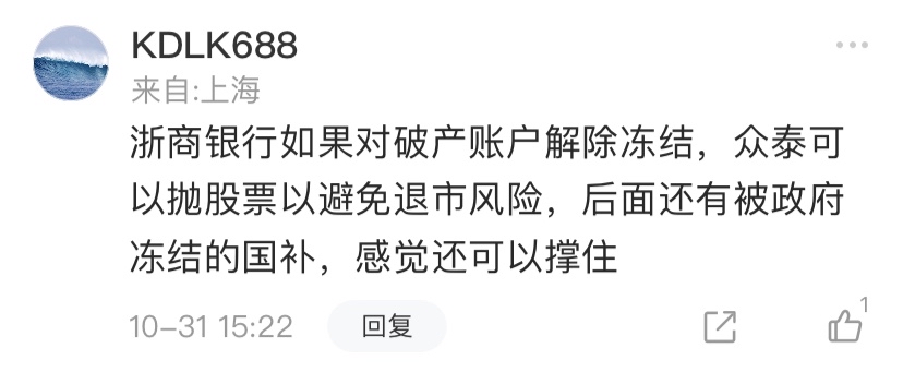 $众泰汽车(SZ000980)$ 按预期在走,本周应该就会有浙商银行解除破产账户冻结的公告,毕竟现任董事会是浙商银行提名的,这样众泰就规避了净资产为负的退市风险警告。为后面的发展赢得宝贵的时间。利好!