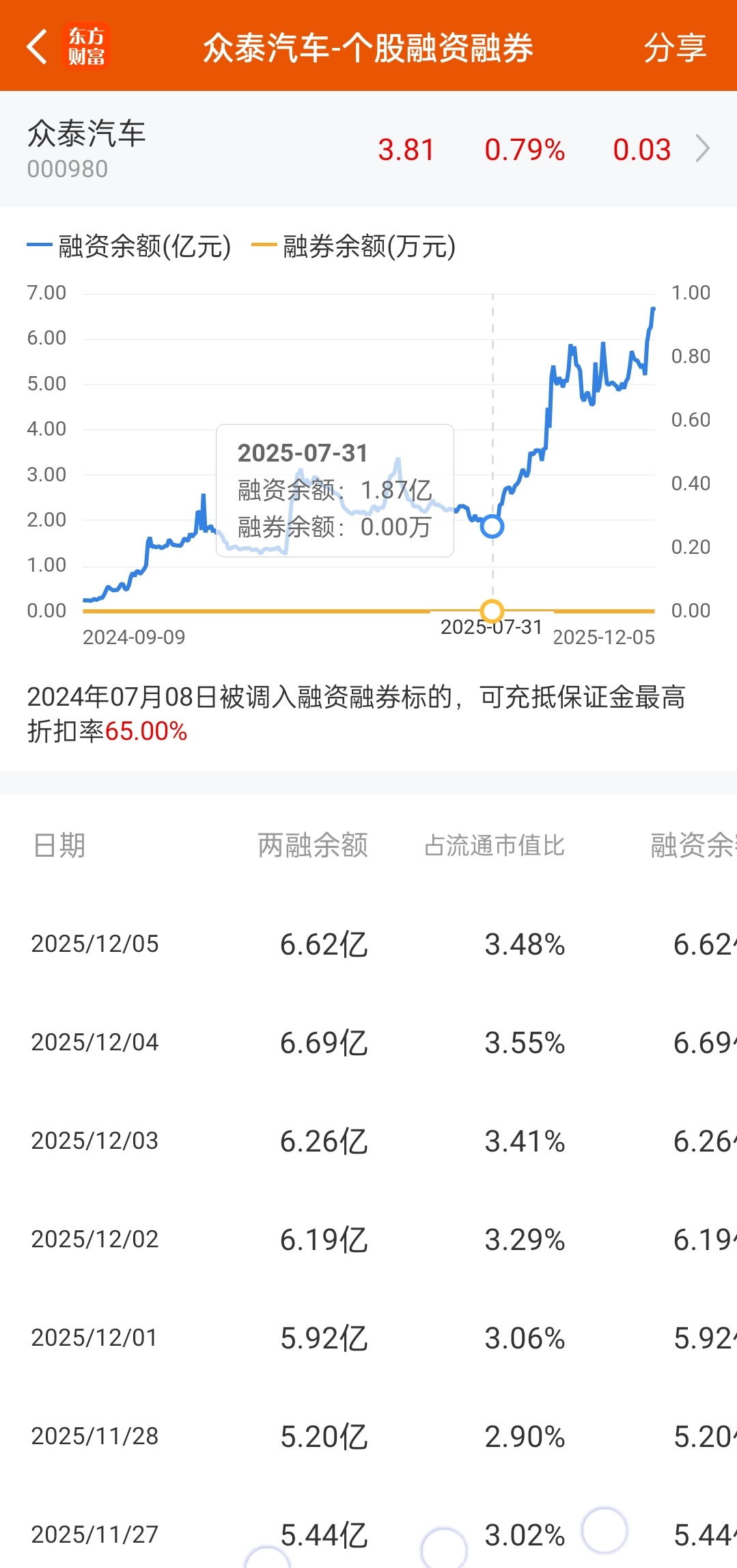 $众泰汽车(SZ000980)$ 现在怀疑融资从8月份1.9亿到现在的6.62亿增加的近五个亿是不是机构配合庄家故意拉升帮十大银行拉升股价化债,半辆车都造不出来,还复工复产真是天大笑话,把股民当傻必,当初深商抵押股权给九台拿到重整资金也是瞒报,不然股价在9.94甚至8块我也全卖了……现在又来悬牛头卖狗肉
