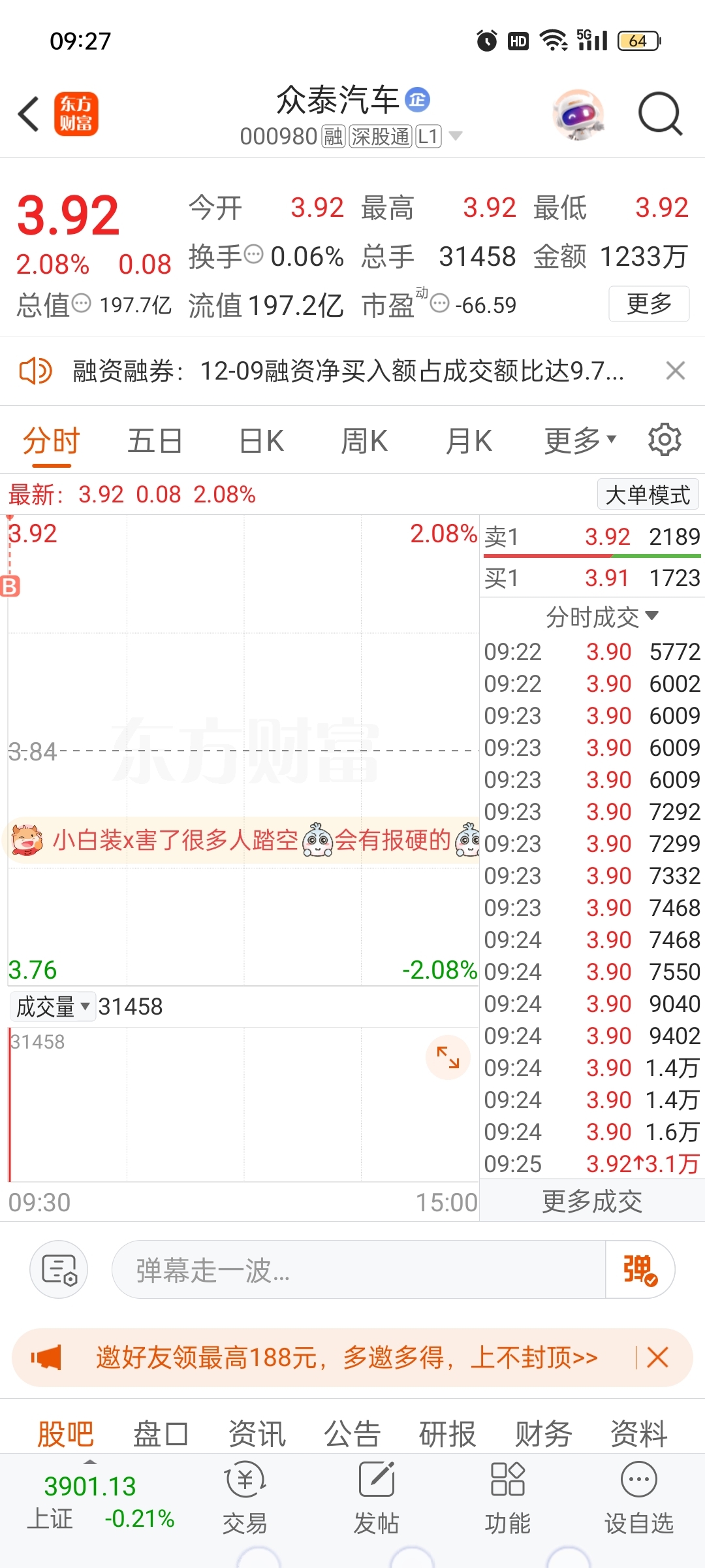 $众泰汽车(SZ000980)$ 竞价开盘看见弹幕有人在骂我,我每天早上起来确实都是硬的