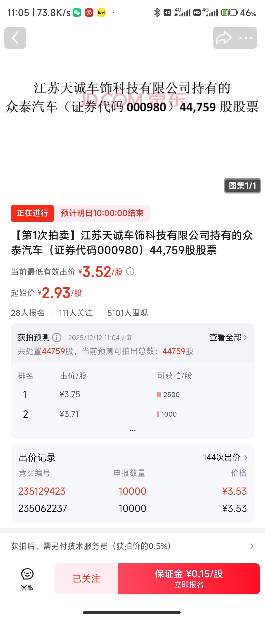 $众泰汽车(SZ000980)$ 东子上有拍卖。3.5一股,速度冲,明天结束