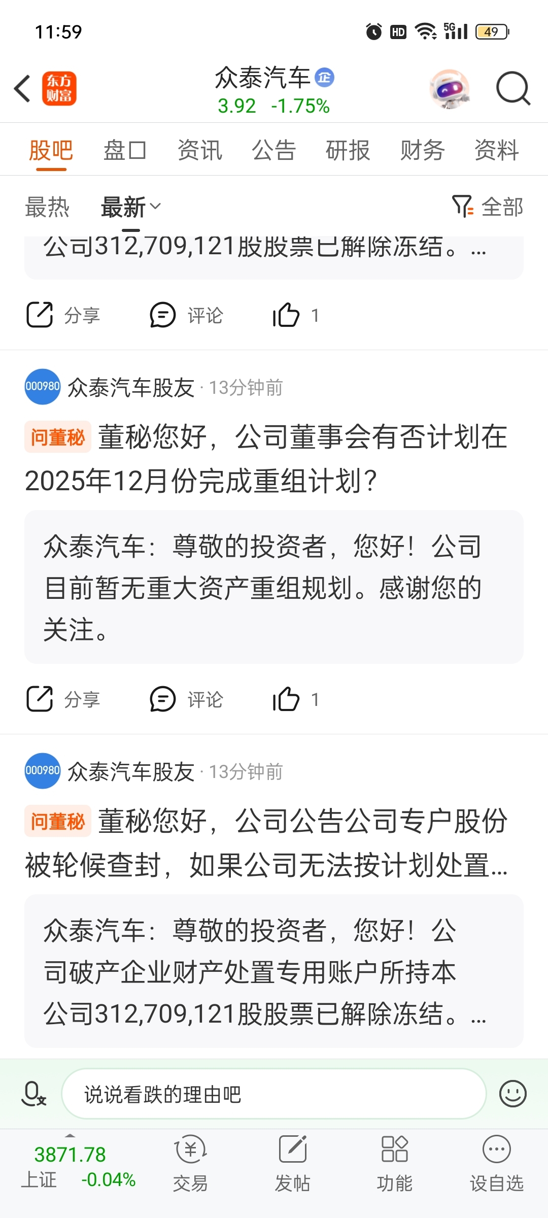 $众泰汽车(SZ000980)$ 中午吃饭时间董秘还在加班回复老掉牙新闻,今天缩巨量,没人接盘不好出货急了吧?要被浙商实控人骂了,给我加班加点人气搞来