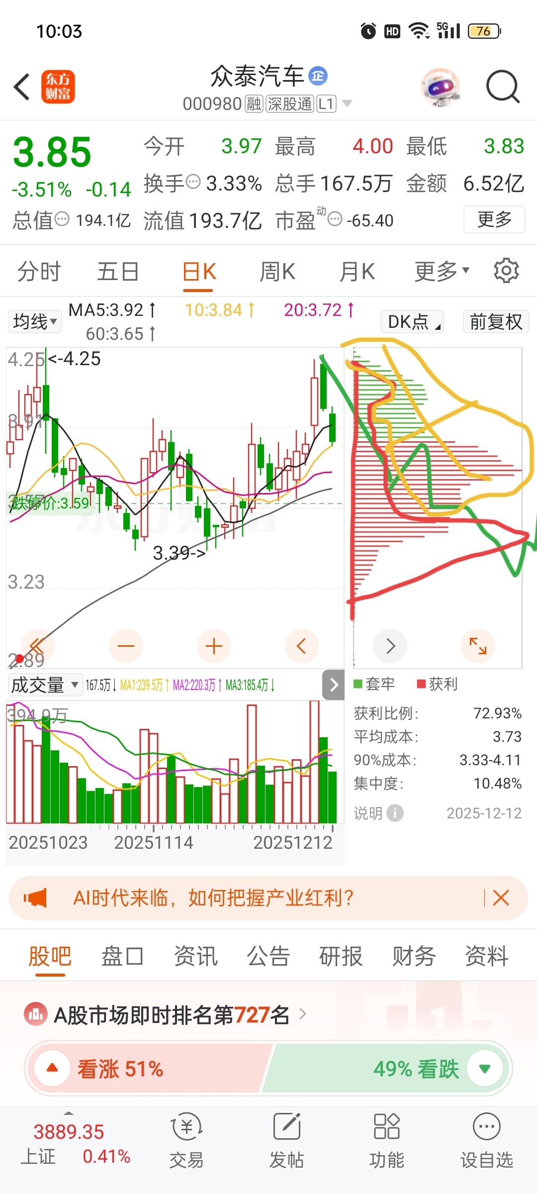 $众泰汽车(SZ000980)$ 一旦开启下杀没有最低只有更低,元旦前机构主力要撤资做账算利润,4~3.5筹码峰必须消化下移才有上涨可能性,庄家配合主力打压,本月底破产账户减持可能不会减持太多,0.5%都不会到,到时2025年度净资产正式爆雷为负,2026年进入*ST时代,让我们拭目以待吧,我就提早预测给你们看,免得到时说我放马后炮。2025年12月14日,小白。