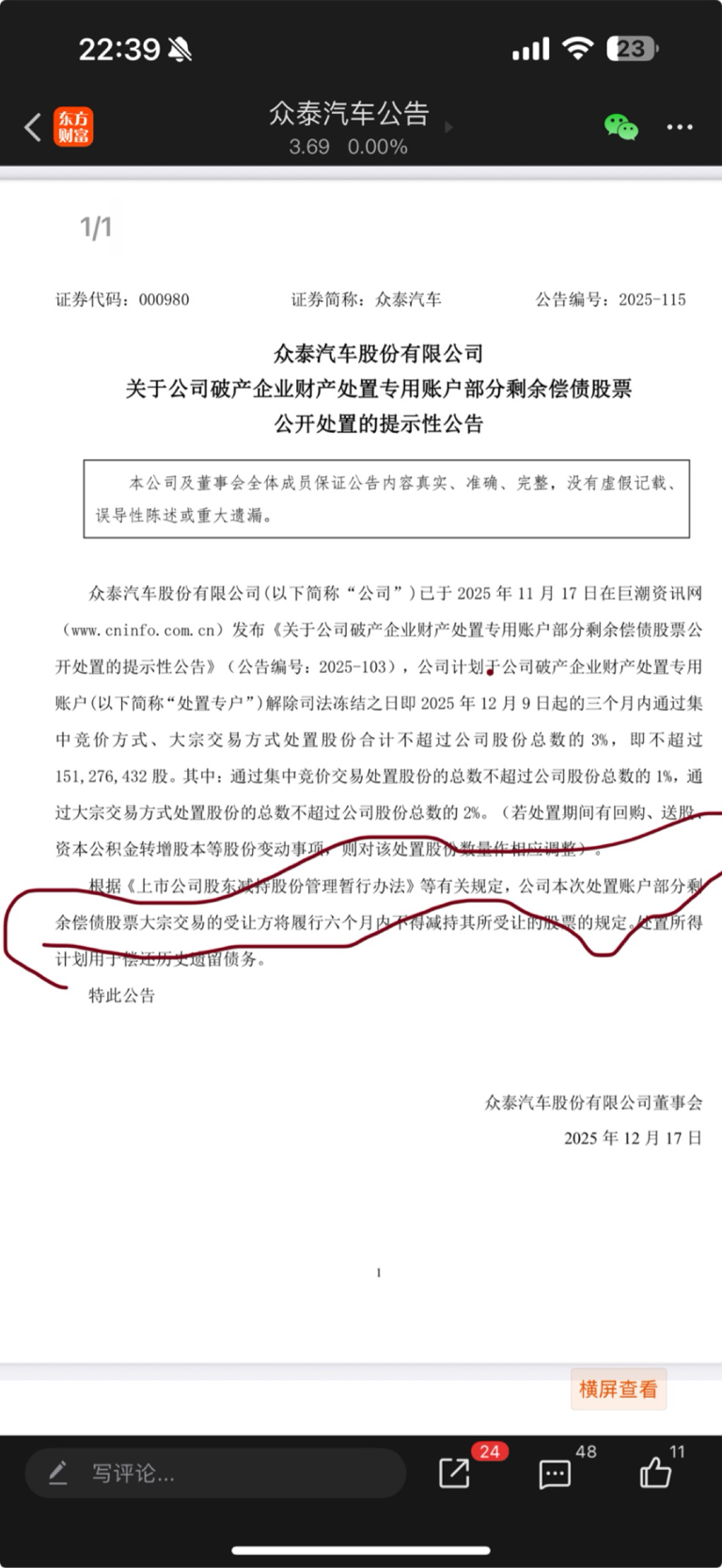 $众泰汽车(SZ000980)$ 本次处置剩余部分偿还债务大宗交易,睡觉我感觉不难理解。