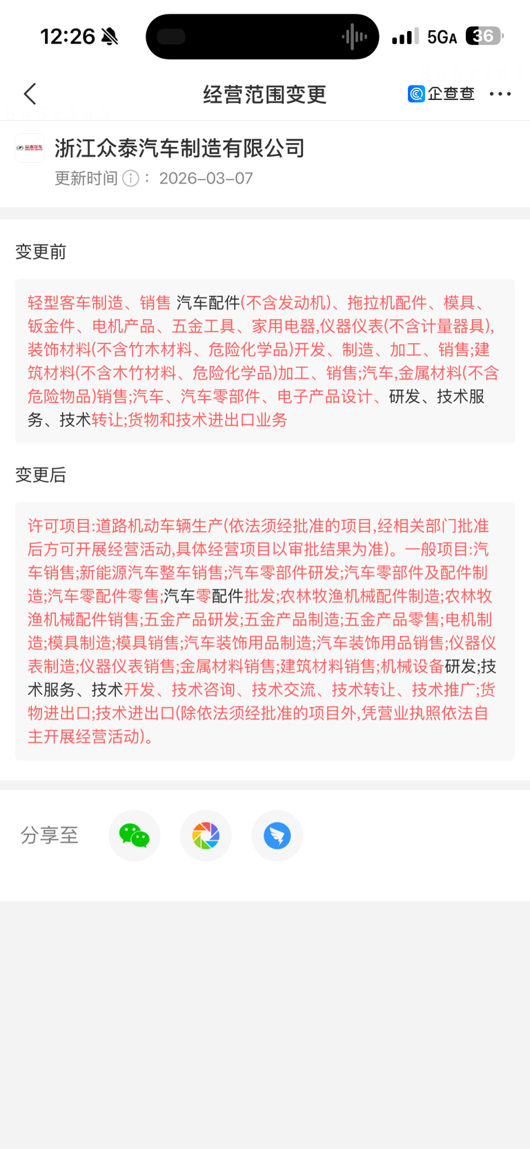 浙江众泰汽车制造汽车经营范围变更。释放出的信号。