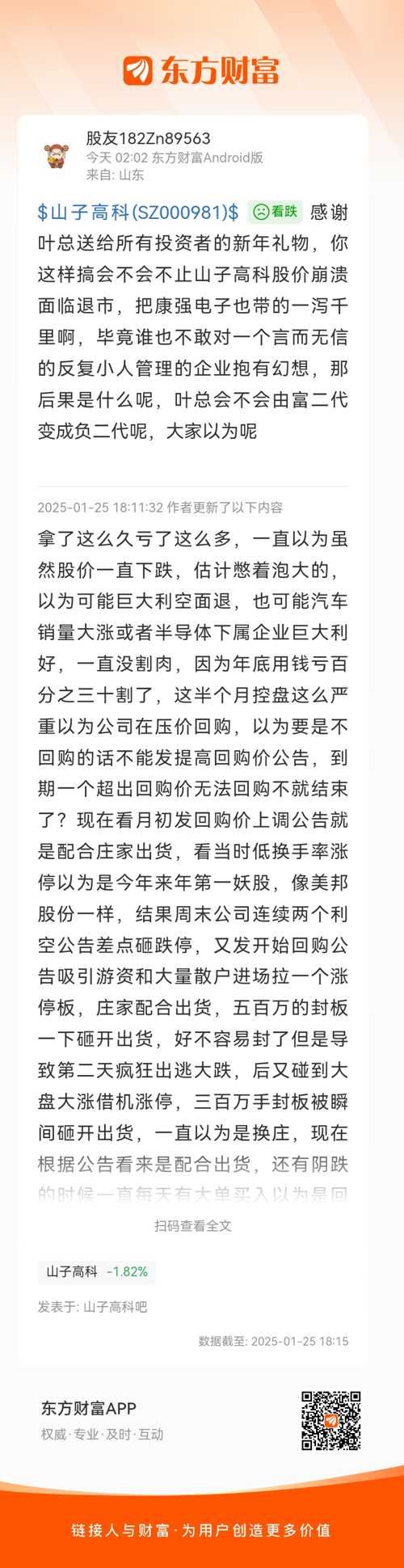 $山子高科(SZ000981)$ 感谢叶总送给所有投资者的新年礼物,你这样搞会不会不止山子高科股价崩溃面临退市,把康强电子也带的一泻千里啊,毕竟谁也不敢对一个言而无信的反复小人管理的企业抱有幻想,那后果是什么呢,叶总会不会由富二代变成负二代呢,大家以为呢
