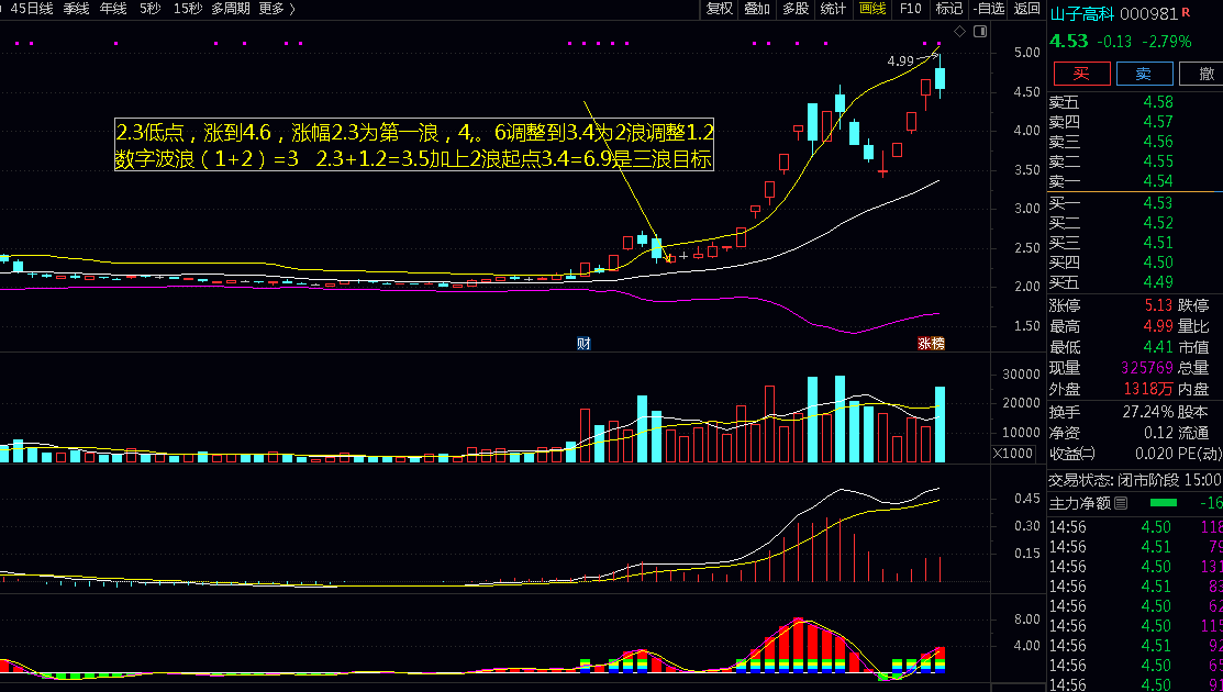 第一浪:2.30---4.60(时长13天)涨幅2.3