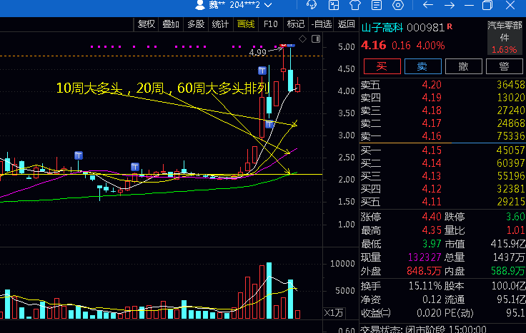 涨停回调法:4.25是涨停位,调整中依然站住,时间按照3--5天整理,成交量缩小到27.%的一半以下时候,反弹就会如期出现。由于该股是整合整车,有阿里巴巴合作,估值可以超越6元,而且6元也是三浪目标