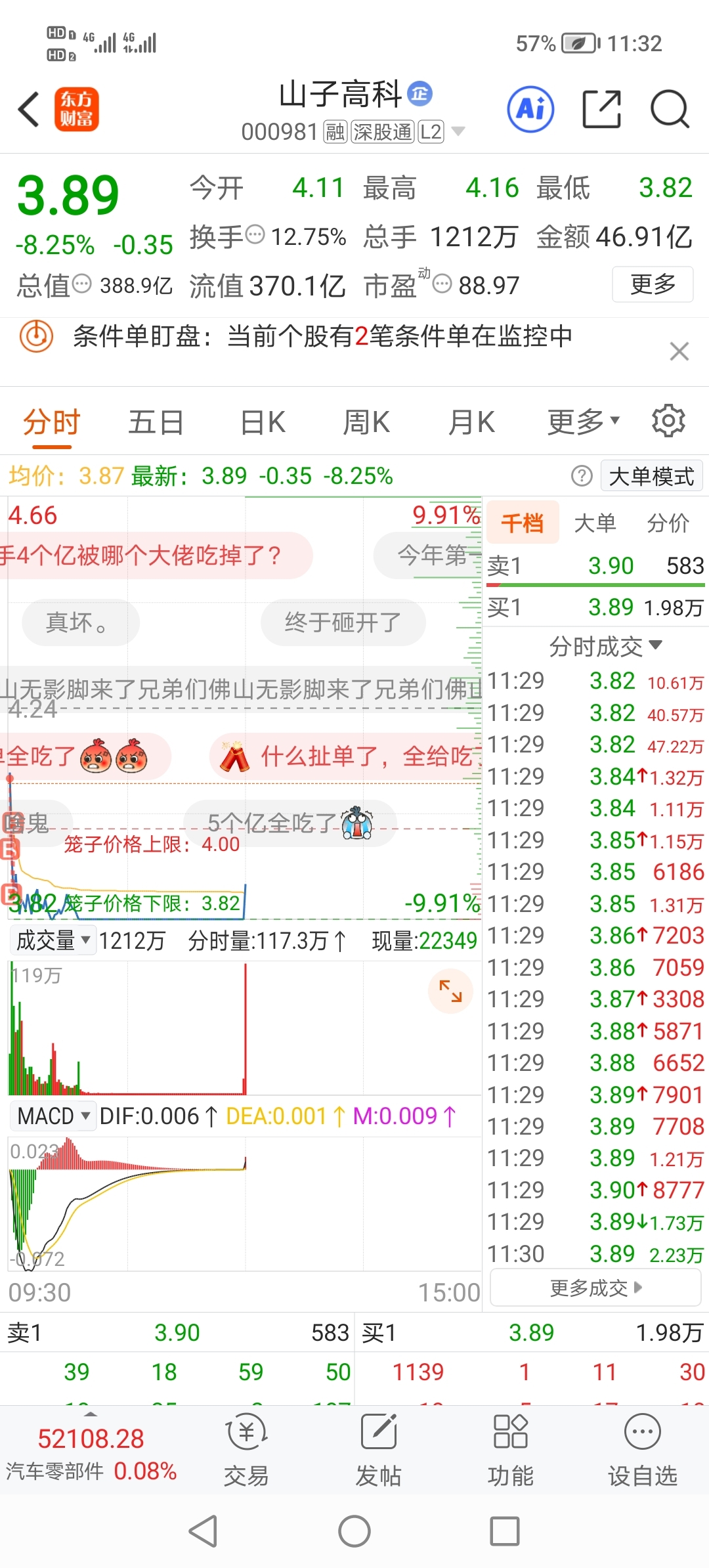 $山子高科(SZ000981)$ 卖盘枯竭?百万手进货