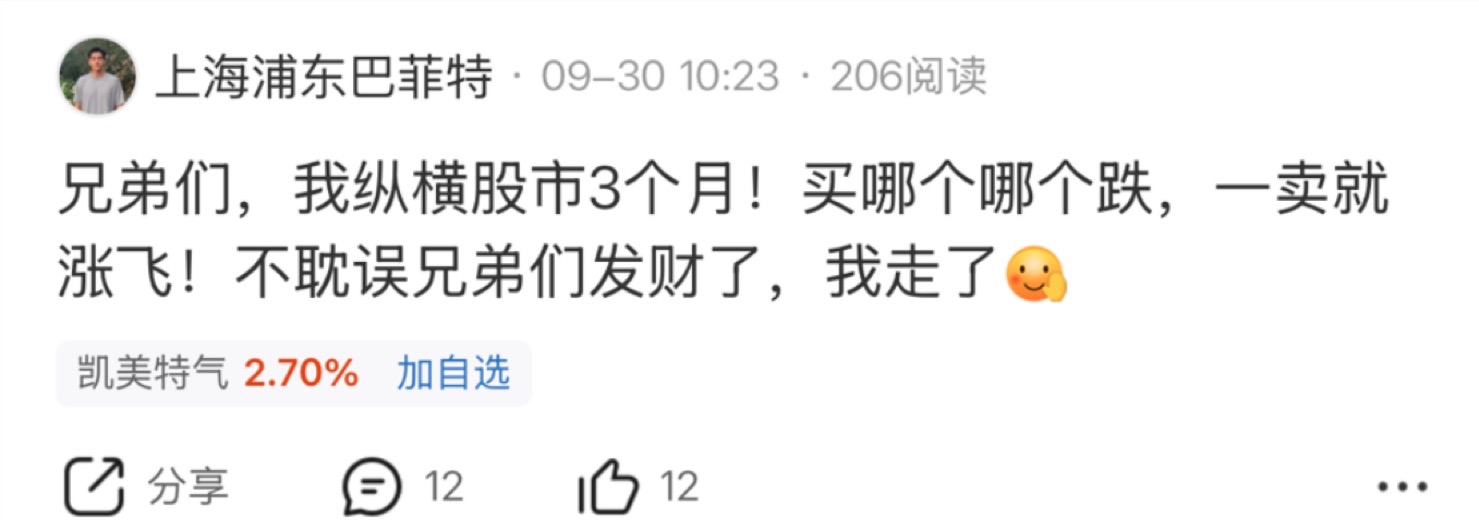 $山子高科(SZ000981)$ 我来告诉大家为什么山皇龙头票还会有人喊空。如截图所示,这是一个在吧里不停喊空的人,我看了下他的主页,他是一个买啥跌啥的韭菜选手,9月23日在山子的分歧日他买了看多,然后在山子之后的调整段卖飞,错失了二波的两板。被我发现之后他把9.23日的帖子删了。他就是因为眼红难受所以不断喊空。