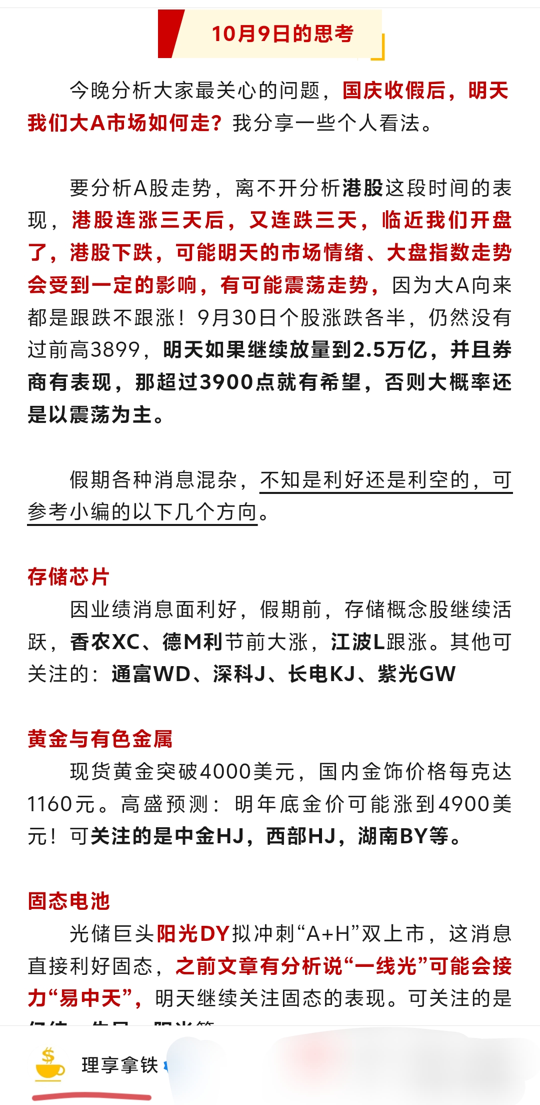 今晚分析大家最关心的问题,国庆收假后,明天我们大A市场如何走?根据这些天的观察研究,我分享一些个人看法,完整版的分析可到图中左下角那里去看。