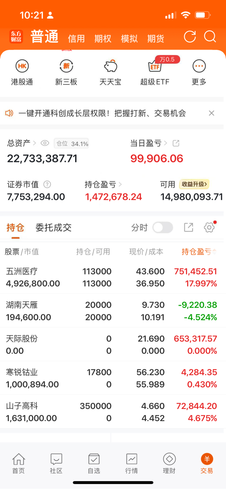 各位中午好!早盘$山子高科(SZ000981)$ 竞价活跃,作为板块低价股,很容易收资金关注,没等回调小追了一下。$寒锐钴业(SZ300618)$ 筹码布局的还不错,且趋势明显,介入试错,低位自行补就好!$天际股份(SZ002759)$ 上个交易日减仓20万股,留了几千今日出局了。虽说成功3进4,还是先落袋为安吧。五洲医疗:每天都有拉高出局的机会。边走边看。