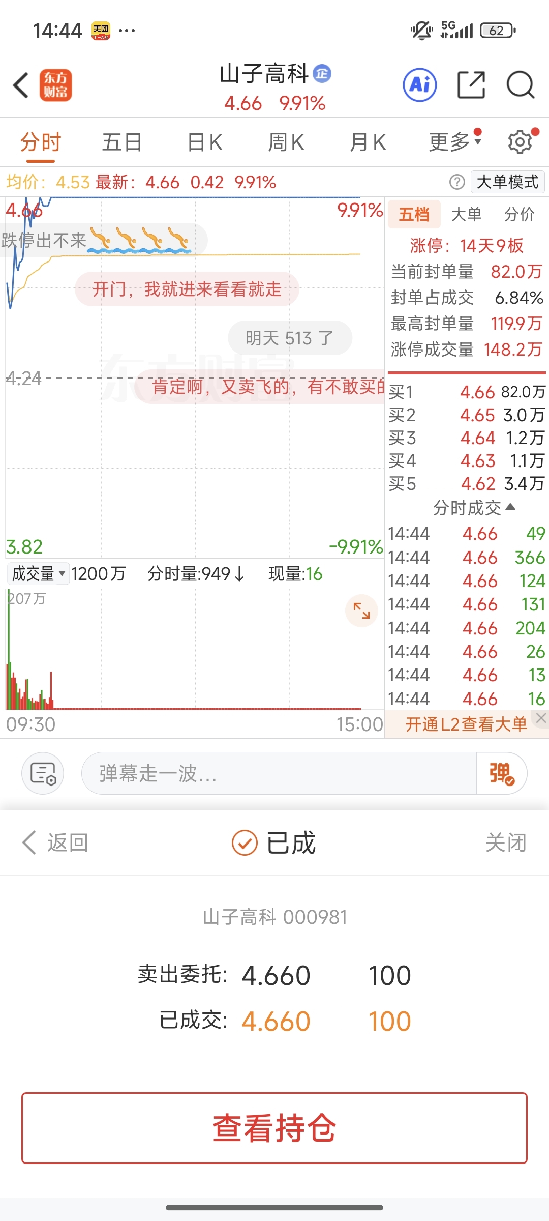 $山子高科(SZ000981)$ 卖100给你们打板机会