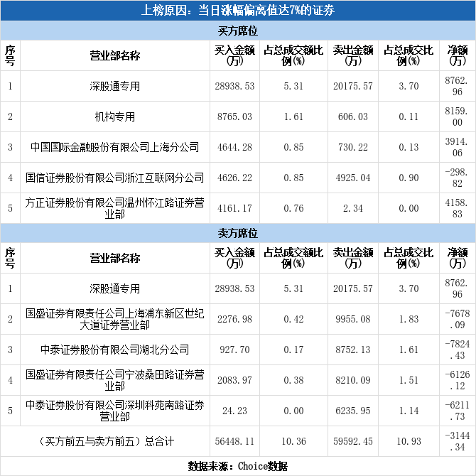 今日龙虎榜单上出现了深股通的身影,占据了买一、卖一的位置,净买入8762.96万元,占当日成交总额的1.61%。