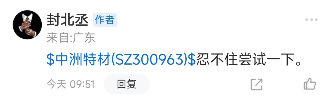 接着看好尝试了$中洲特材(SZ300963)$ 最近那么火热,趋势也还在,感受一下20cm