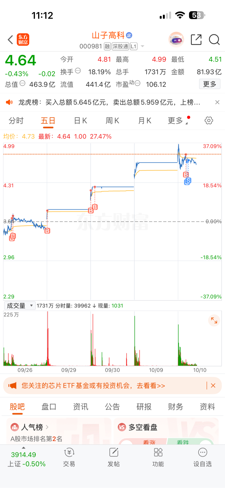 $山子高科(SZ000981)$ 放量了,那我就走了