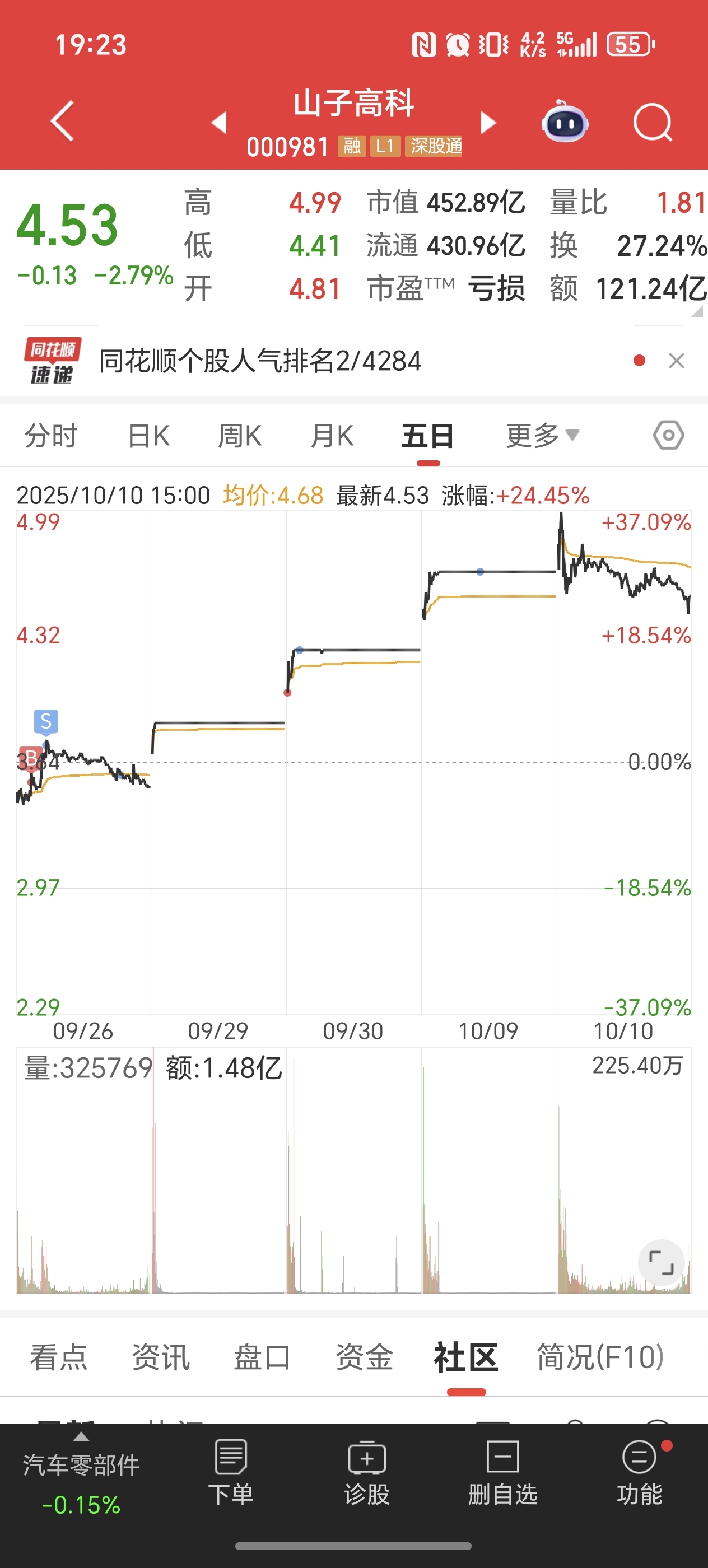 $山子高科(SZ000981)$ 昨天感觉大盘不对就全出了,今天换了岳阳兴长