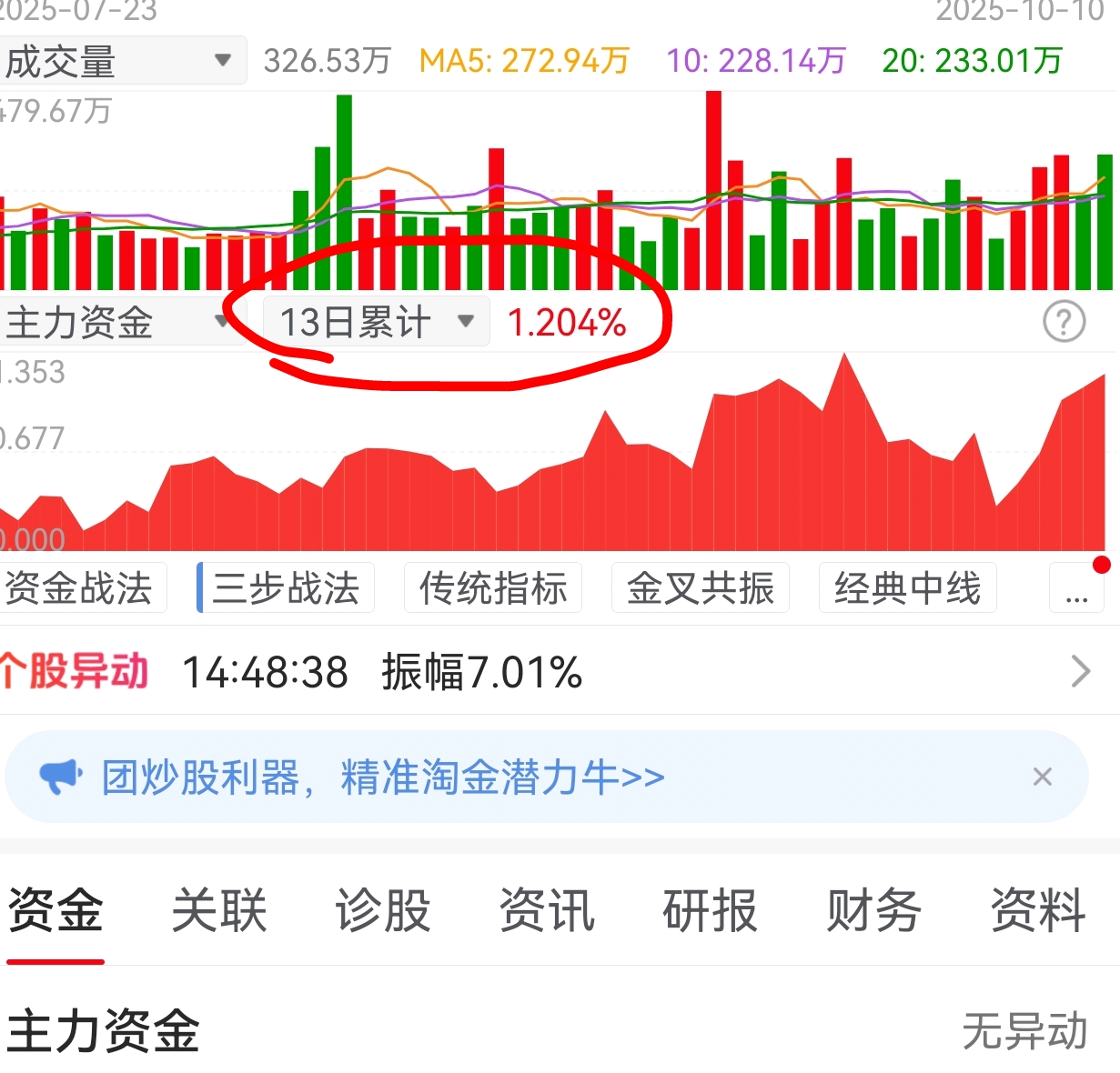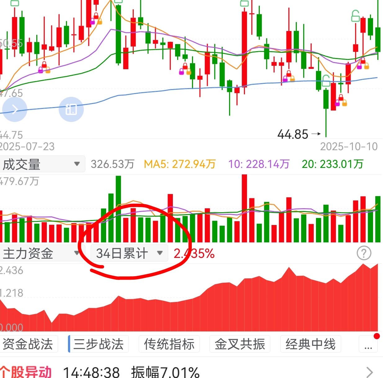 5日,13日,34日,主力资金一直在买。有收费软件,自己也可以查询一下。