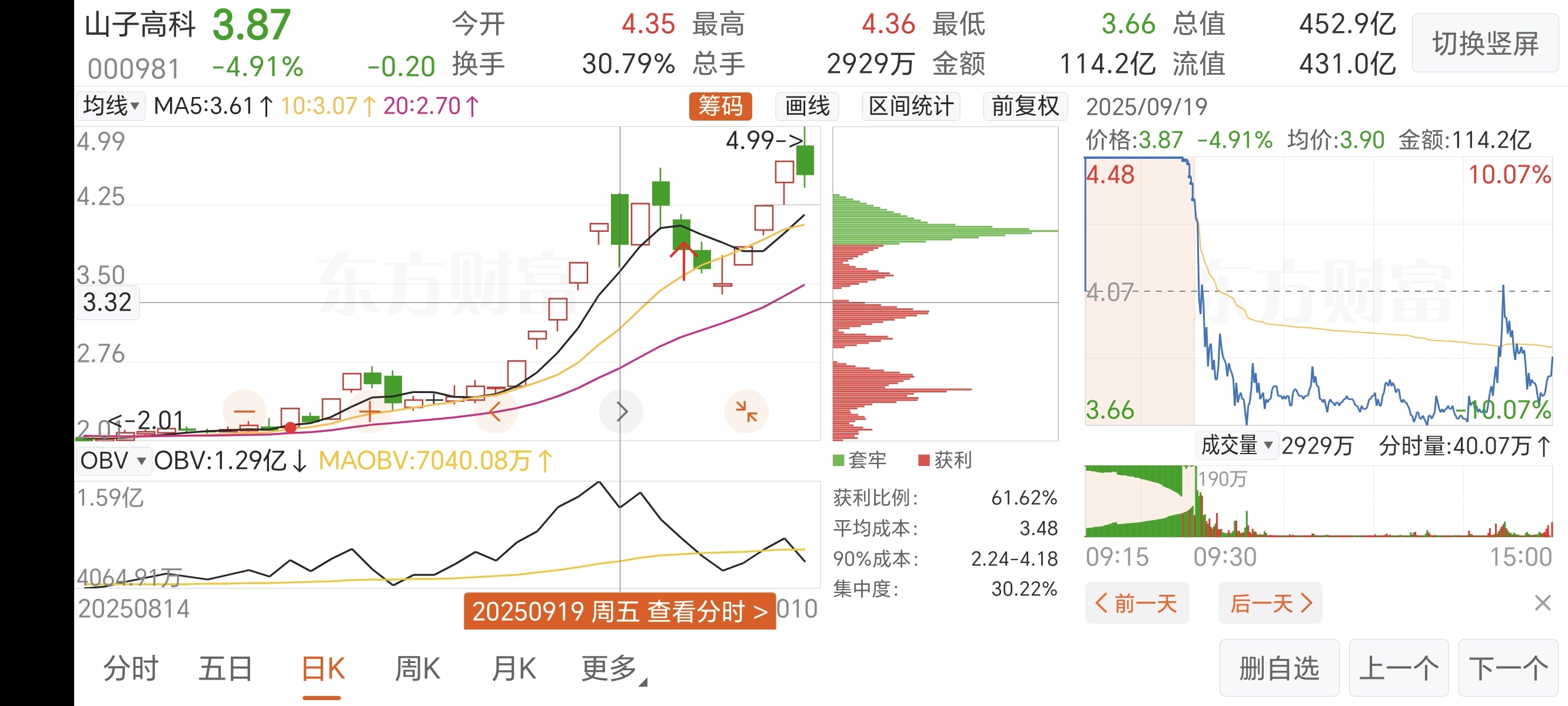 $山子高科(SZ000981)$ 今天的走势跟成交量很像9月19,恰巧也是周五,恰巧也是第一波连板后首阴,周一有没有可能高开甚至涨停复制9月22日,然后后续开启第三波主升