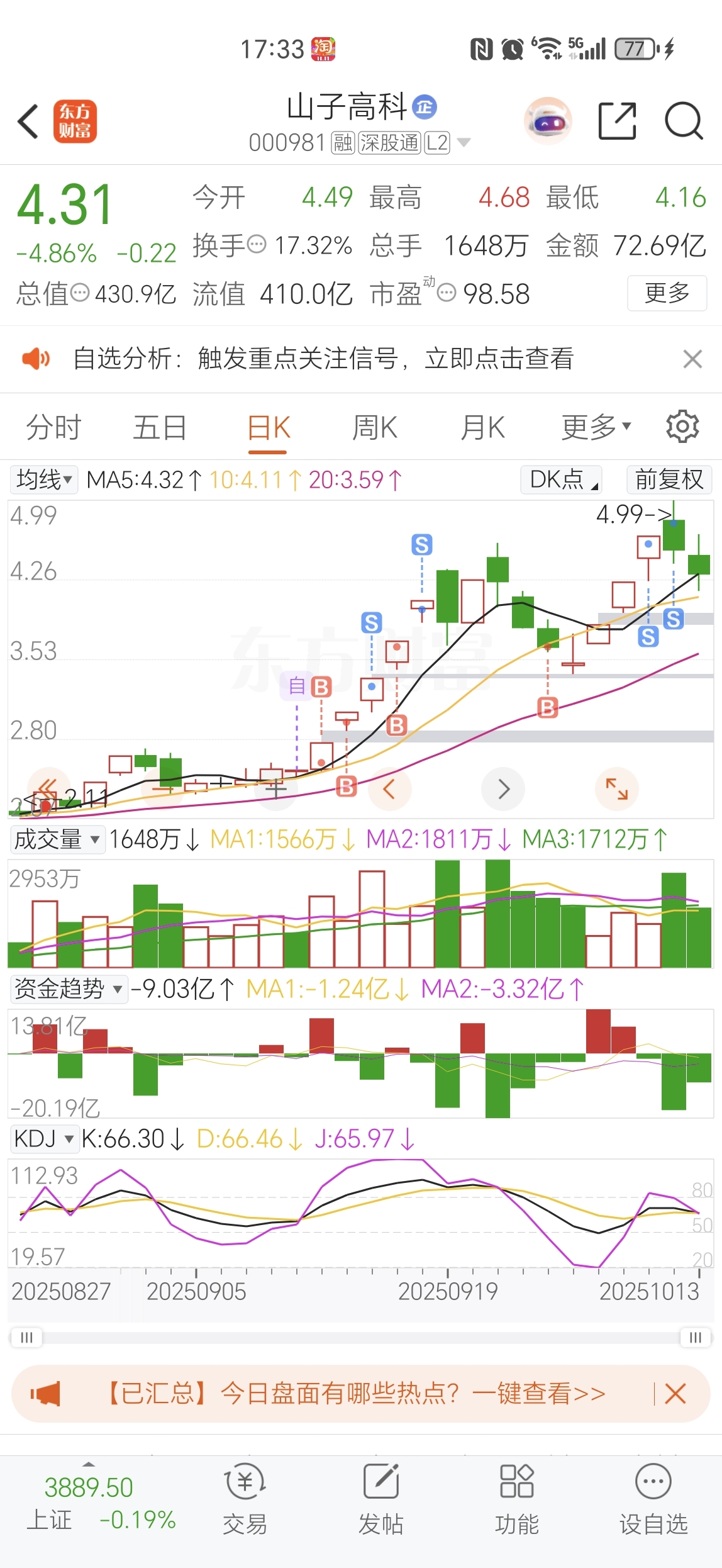 $山子高科(SZ000981)$ 有低点再入,个人感觉已经到月内高点了,只赚认知以内的