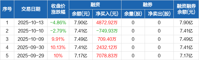 融资方面,当日融资买入2.89亿元,融资偿还2.4亿元,融资净买入4872.92万元。融券方面,融券卖出0股,融券偿还0股,融券余量0股,融券余额0元。融资融券余额合计7.9亿元。