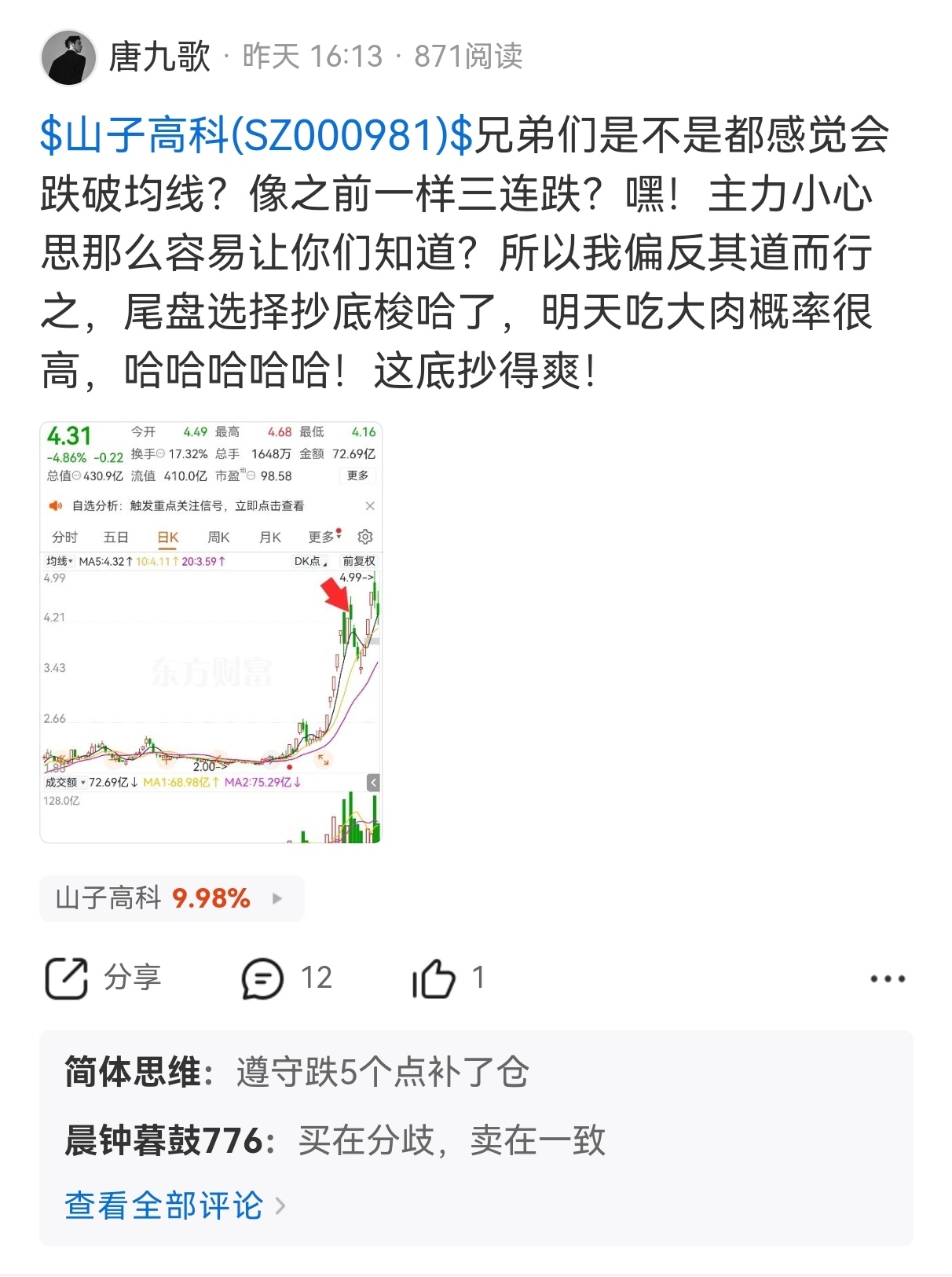 $山子高科(SZ000981)$ 哈哈哈哈,我说什么来着?这底抄得爽!!当股吧一致看空时,我就知道时机到了!