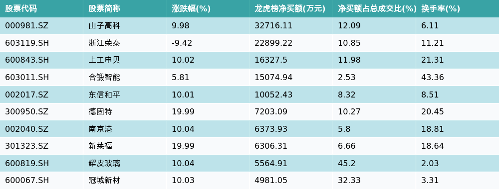 南财智讯10月14日电,南财金融终端数据显示,因当日异动登上龙虎榜的个股中,资金净买入最多的前三位分别是山子高科(000981.SZ)、浙江荣泰(603119.SH)与上工申贝(600843.SH)。其中排名第一的山子高科净买额达3.27亿元,占总成交金额的12.09%。山子高科当日收盘上涨9.98%,换手率为6.11%,净买入额前10个股详情见下图: