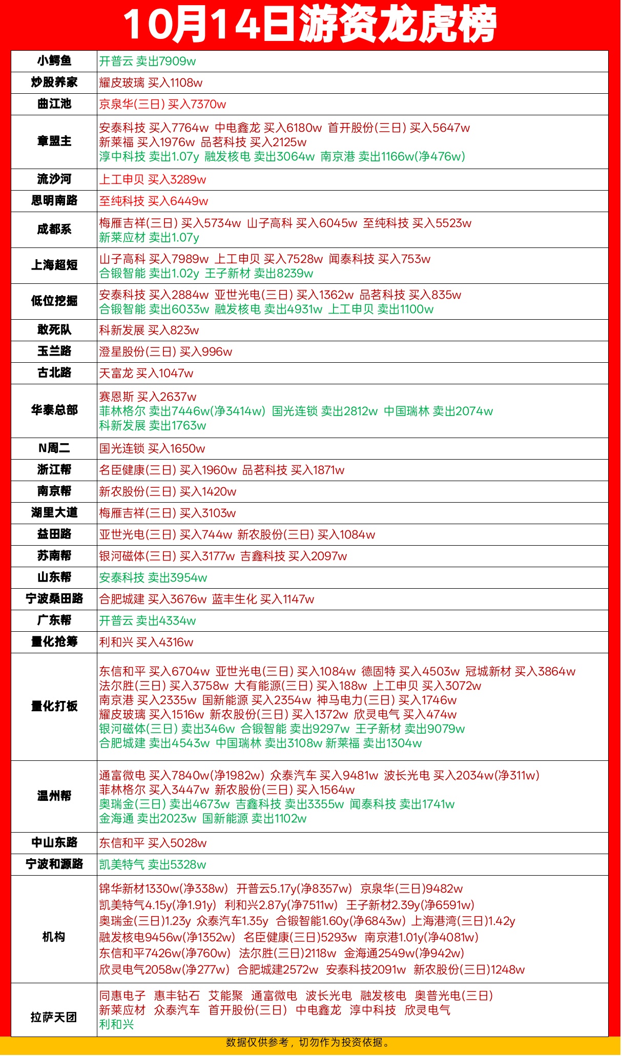10.14游资龙虎榜,小鳄鱼章盟主炒股养家上榜。