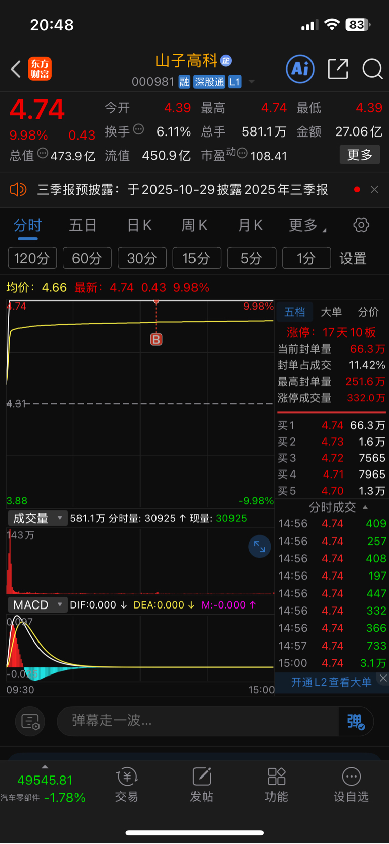 $山子高科(SZ000981)$ 打板竟然排进去了,明天有溢价没