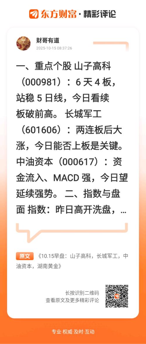 $山子高科(SZ000981)$$长城军工(SH601606)$$中油资本(SZ000617)$//@财哥有道 :一、重点个股 山子高科(000981):6 天 4 板,站稳 5 日线,今日看续板破前高。 长城军工(601606):两连板后大涨,今日能否上板是关键。 中油资本(000617):资金流入、MACD 强,今日望延续强势。 二、指数与盘面 指数:昨日高开洗盘,放量 2200 亿,今日预计震荡向上。 盘面:情绪降温,资金偏好业绩确定板块(如培育钻石、煤炭),今日主基调谨慎。 三、持仓计划(均 “继续格局”) 天下秀、赛力斯:企稳 10 日线,待情绪修复反弹。 江西铜业、中兴通讯:看 5 日线支撑,大势回暖望转强。 北方稀土:供需紧平衡,今日或整理后上行。 湖南黄金:贵金属支撑,大概率红盘震荡或冲高。