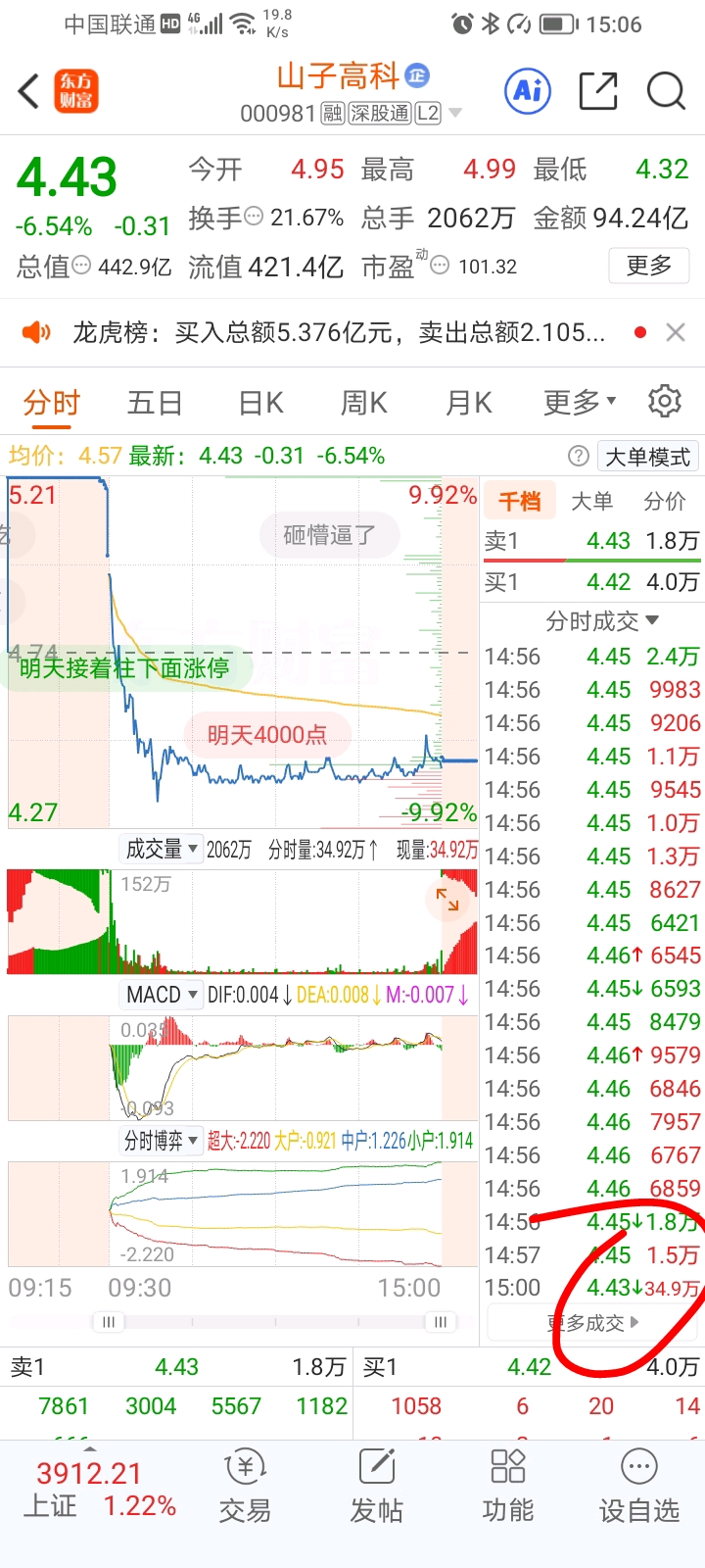 $山子高科(SZ000981)$ 很多人不懂,最后这笔单子是买入还是卖出,我来告诉你们,这叫被动买入,接盘人当然是拉萨。在接近收盘时为啥有大量买单顶,就是诱多,当所有散户都跟单买入时,主力最后一秒一卖就砸在家人们手里了