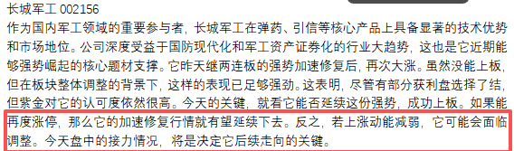 $长城军工(SH601606)$:作为国内军工领域的重要参与者,长城军工在弹药、引信等核心产品上具备显著的技术优势和市场地位。公司深度受益于国防现代化和军工资产证券化的行业大趋势,这也是它近期能够强势崛起的核心题材支撑。它昨天继两连板的强势加速修复后,再次大涨。虽然没能上板,但在板块整体调整的背景下,这样的表现已足够强劲。这表明,尽管有部分获利盘选择了结,但紫金对它的认可度依然很高。今天的关键,就看它能否延续这份强势,成功上板。如果能再度涨停,那么它的加速修复行情就有望延续下去。反之,若上涨动能减弱,它可能会面临调整。今天盘中的接力情况,将是决定它后续走向的关键。