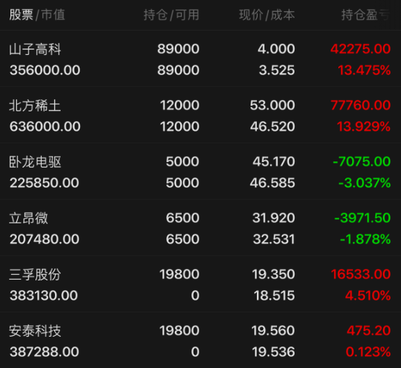 这只东升是盘尾才决定入手的,盘尾进,次日反弹出的策略。不过还有其他两方面的考虑,一是稀土永磁涨价还有预期,这波回调后稀土会作为代表重新起航,另外一个原因是这只技术面没走坏,今天依旧强势创出新高,大盘拉得如此稀碎,它只是冲高回落,只要没伤筋动骨,站稳5均线下周又可以弹起来。