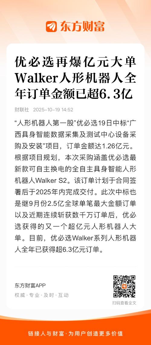 “人形机器人第一股”优必选19日中标“广西具身智能数据采集及测试中心设备采购及安装”项目,订单金额达1.26亿元。根据项目规划,本次采购涵盖优必选最新款可自主换电的全自主具身智能人形机器人Walker S2。该订单计划于合同签署后于2025年内完成交付。此次中标也是继9月份2.5亿全球单笔最大金额订单以及近期连续斩获数千万订单后,优必选获得的又一个超亿元人形机器人大单。目前,优必选Walker系列人形机器人全年已获得超6.3亿元订单。