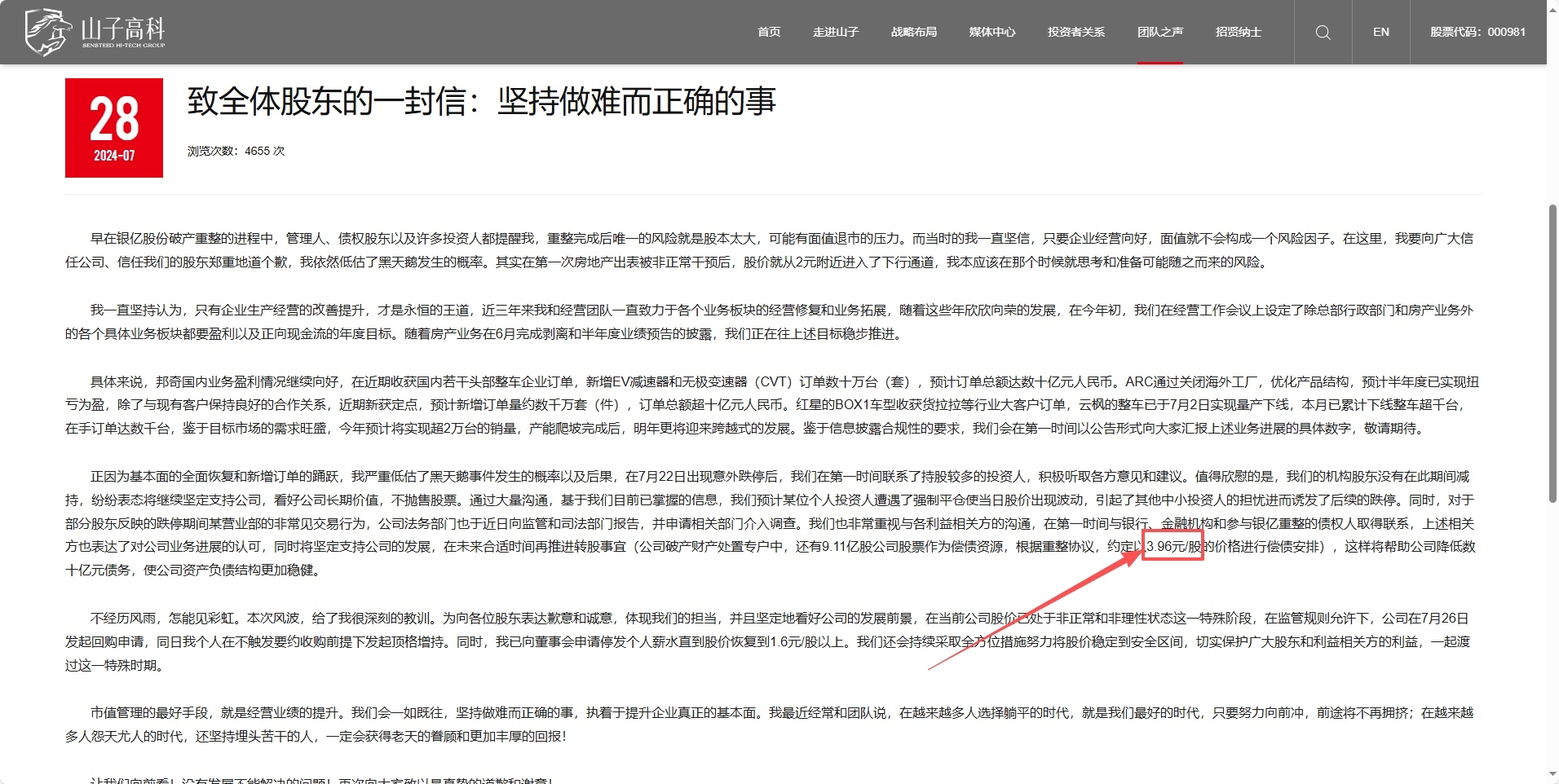 $山子高科(SZ000981)$ 与银行、债权人沟通,未来拟按3.96元/股将9.11亿股重整股票用于债转股。