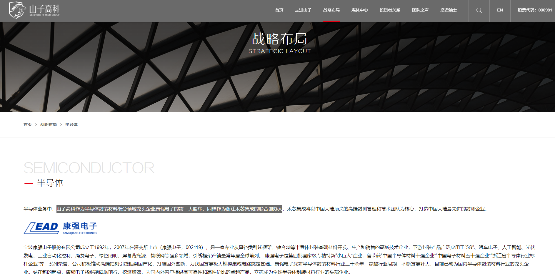 上市公司康强电子002119是山子高科的子公司??山子官网显示:在半导体领域中,