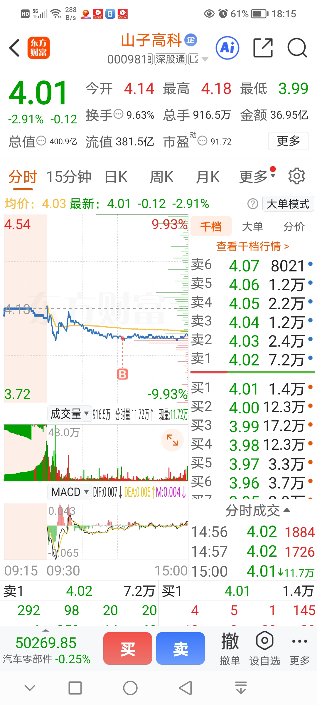 $山子高科(SZ000981)$ 4块打满啦,明天能到4.15,,3个多点入袋