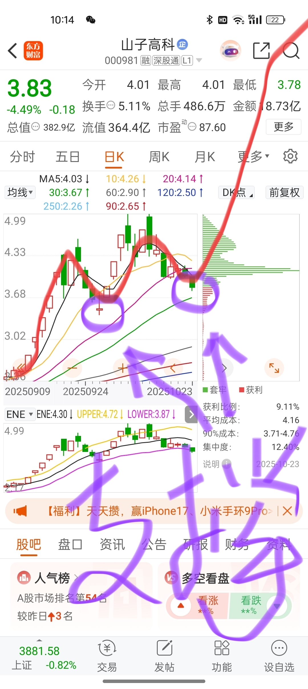 $山子高科(SZ000981)$ 3.8已全仓干入,感觉明天买不到了,后面这样走势