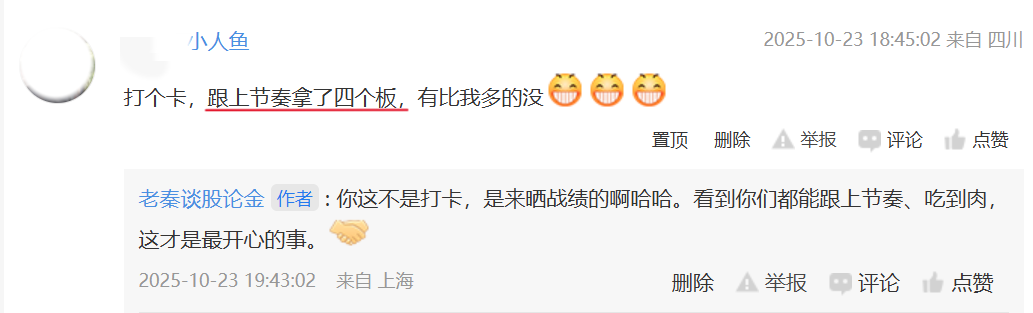 这两天没跟上节奏的朋友别灰心,市场永远有机会!多留意老秦的分享,咱们稳扎稳打,一起把错过的肉慢慢吃回来。