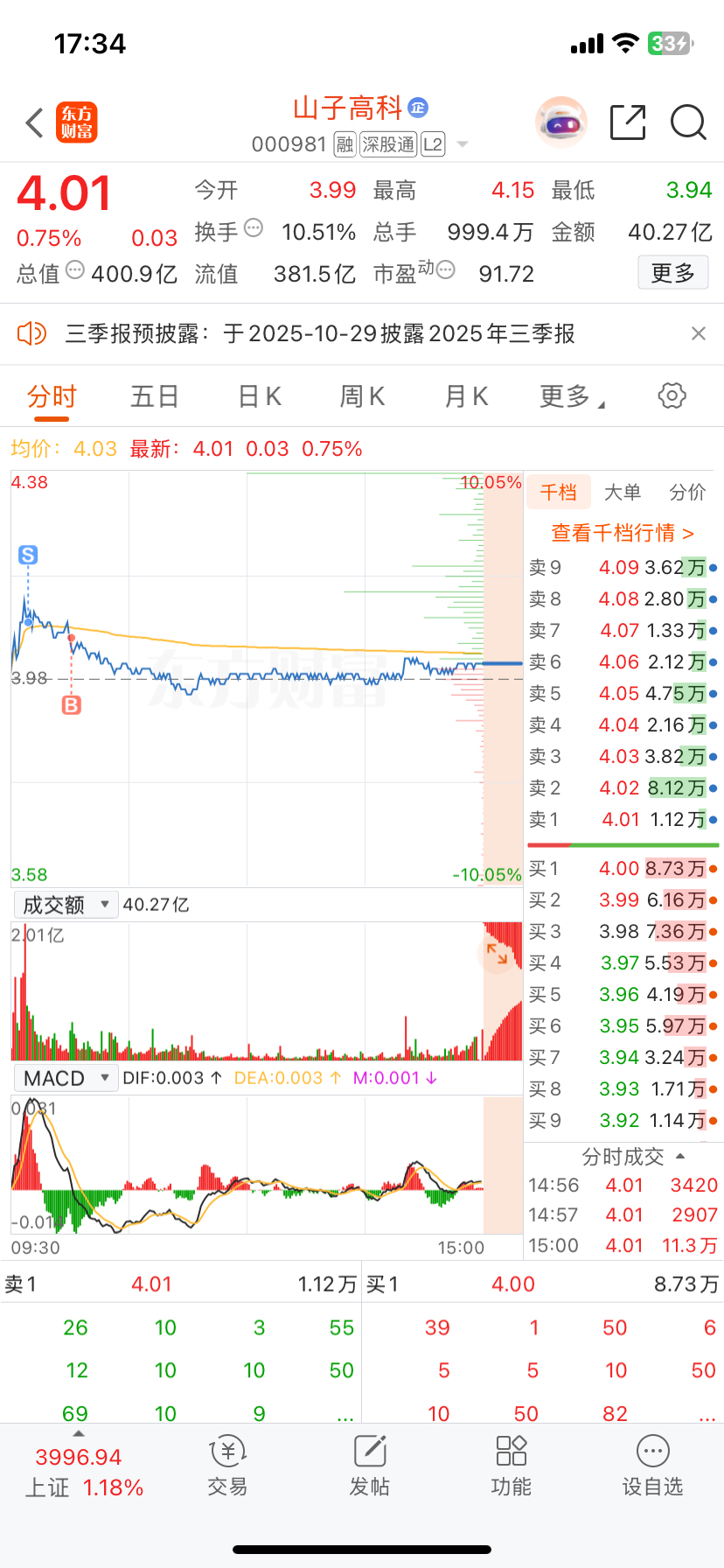 $山子高科(SZ000981)$ 今天拉高清仓了,买100股留着看盘吧,明天低开再接回,山子节奏掌握好不会赔钱,只要不拉涨停,冲高就是卖点。